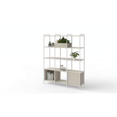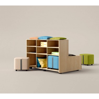Funciona como un sistema modular, que permite generar todo tipo de espacios según las necesidades. Puede configurarse como banco, como plataforma, como estantes. Es una grada multifuncional como los espacios de trabajo actuales.