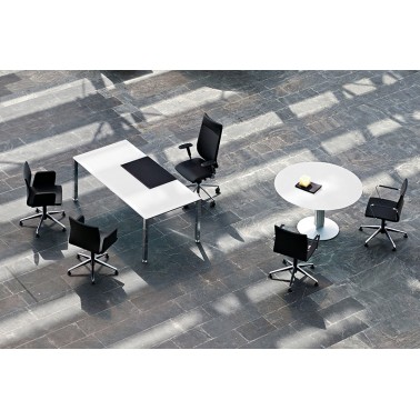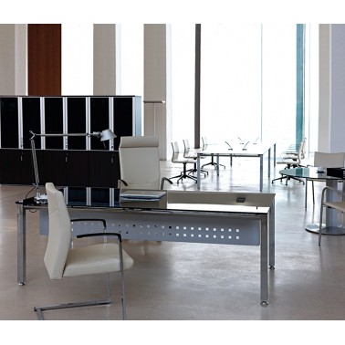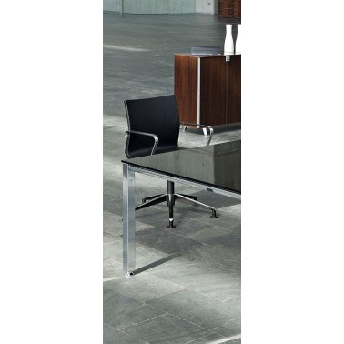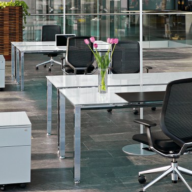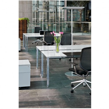 Base cristal en diferentes acabados sobre estructura de acero. Pie en sección cuadrada de 50 mm. Diseñada para un fácil montaje (easy assembly). Posibilidad de elegir acabado estructura: blanca, aluminizada (gris) o cromada (brillante). En caso de tener interés por la cromada, solicitar presupuesto.