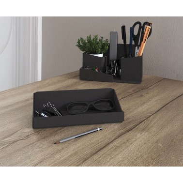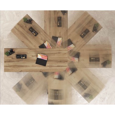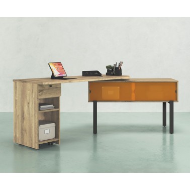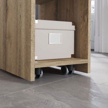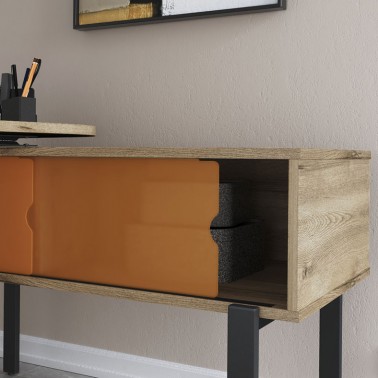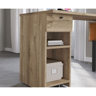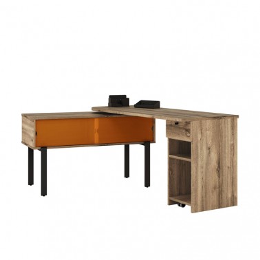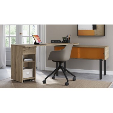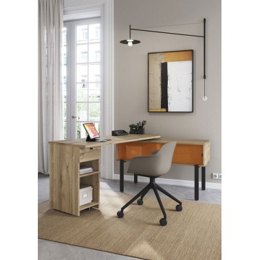 Su diseño se compone de un sobre giratorio 360º, un módulo lateral con cajón y estantes abiertos y una consola auxiliar con puertas correderas, configurando un puesto de trabajo completo en un formato reducido. El sistema de giro permite adaptar la posición del tablero según el uso, facilitando una organización dinámica del espacio.