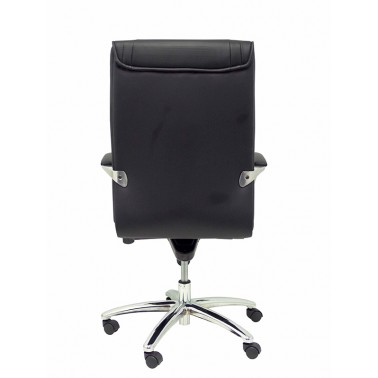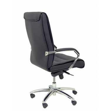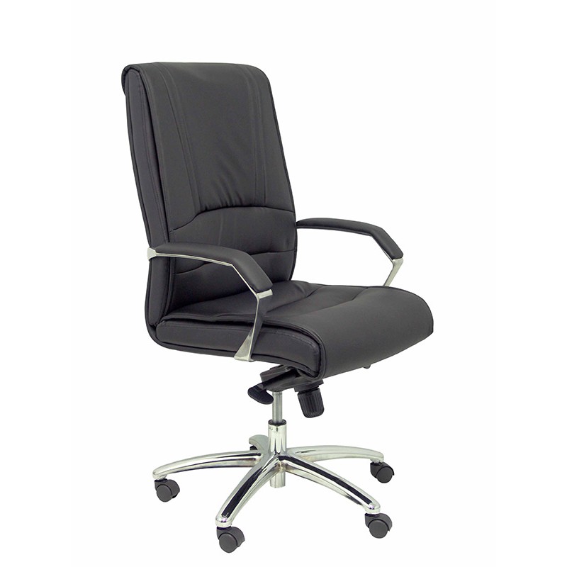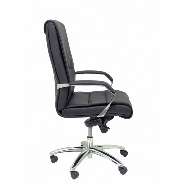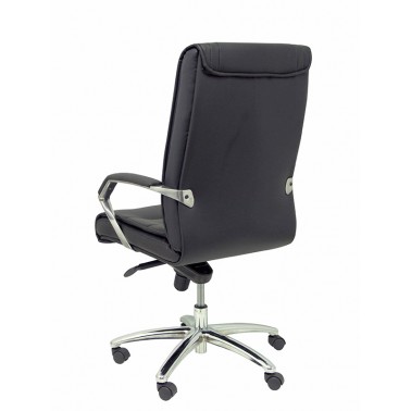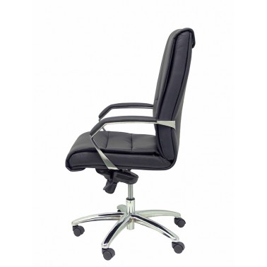 Elegante sillón con respaldo alto, que se completa con base de ruedas de acero cromado y cómodos brazos tapizados.