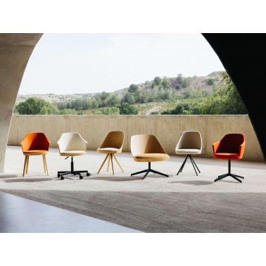 Disponible con baes fija o giratoria, y con o sin tapizado, es una una pieza perfecta para salas de espera, áreas lounge, hoteles o despachos que buscan un equilibrio entre elegancia natural y diseño atemporal.
